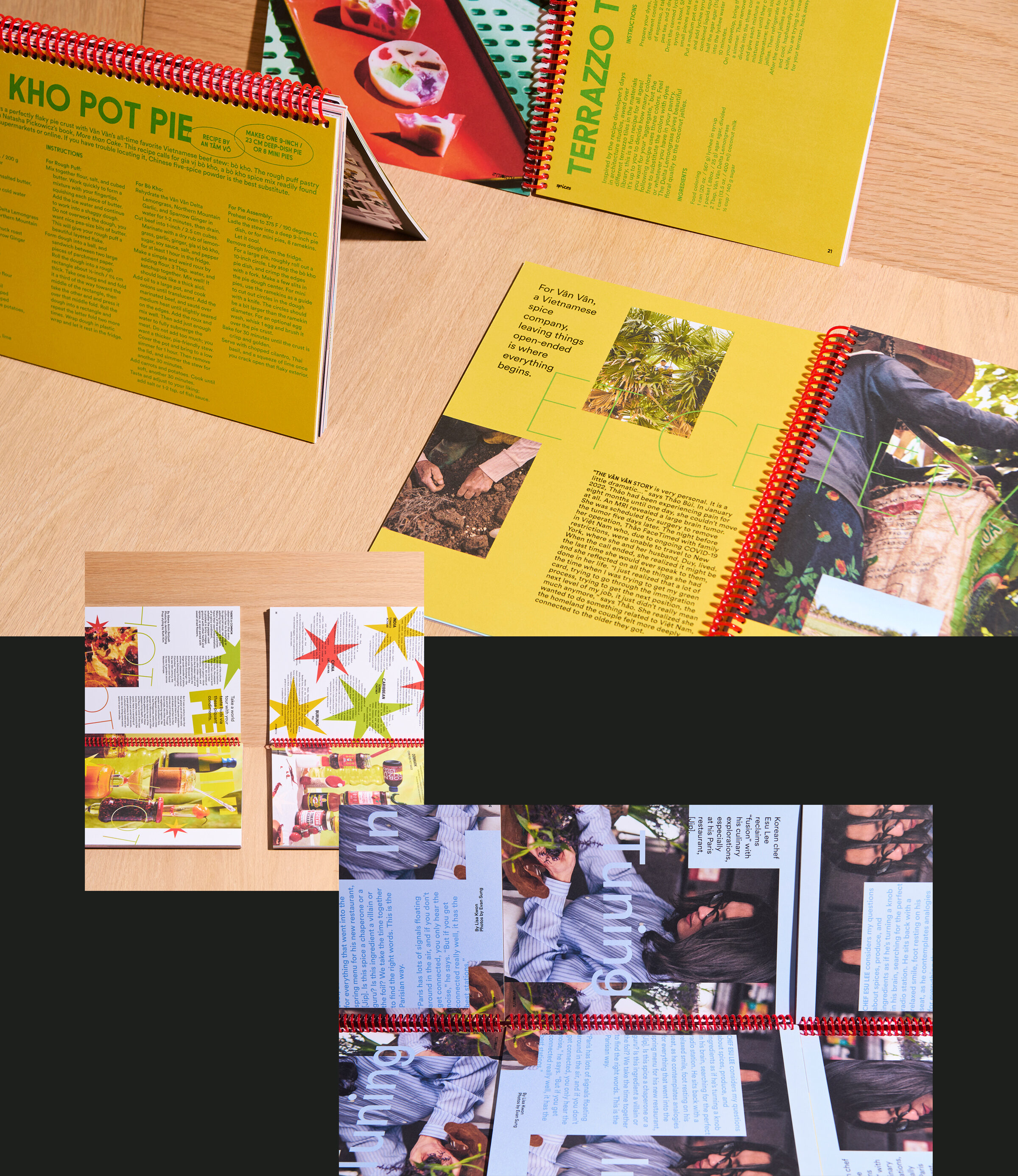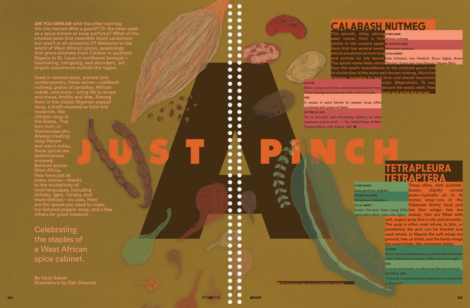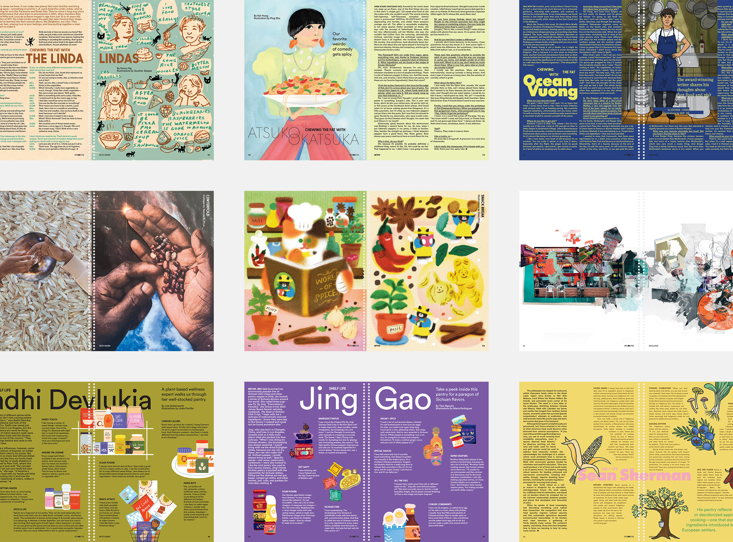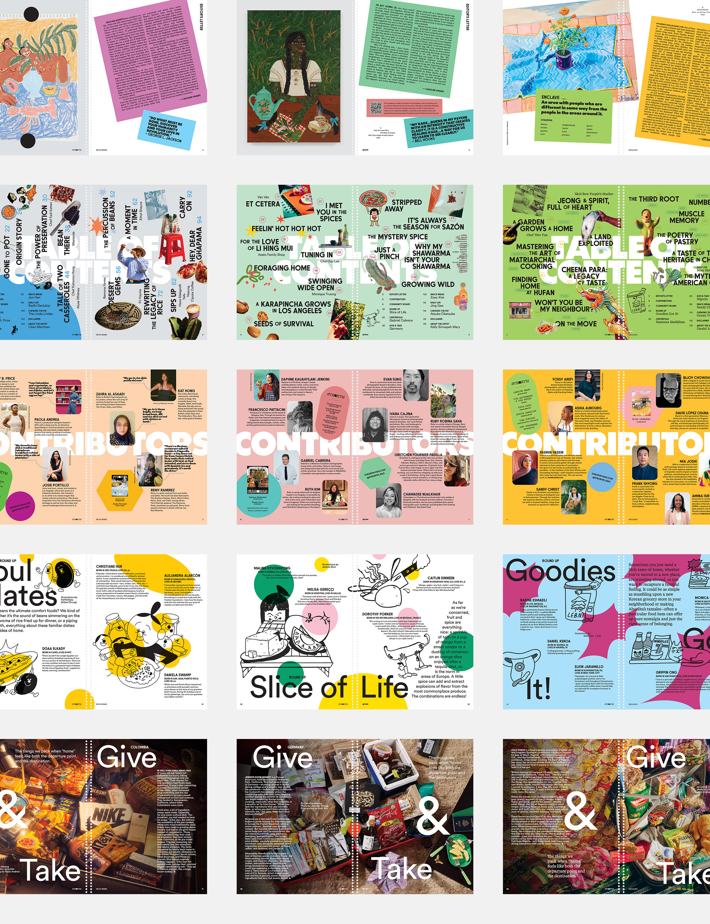 Each issue is based around a theme — pantry, rice & beans, spices, and enclaves so far — so we started assigning a color and implementing a new typeface each time, allowing the design language to grow and evolve while still retaining its overall structure. As opposed to a traditional front and back of book format, recurring stories are sprinkled throughout each issue, breaking up the longer form features when needed. All of the elements are very intentionally gathered — from the writers, the photographers, and the contributing artists — to be a part of and nurture a growing sense of community and connection with each other as these stories are shared.