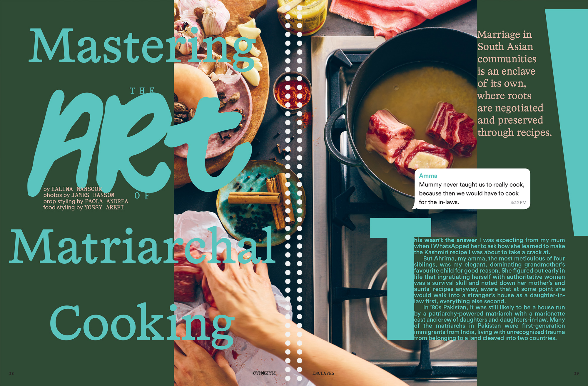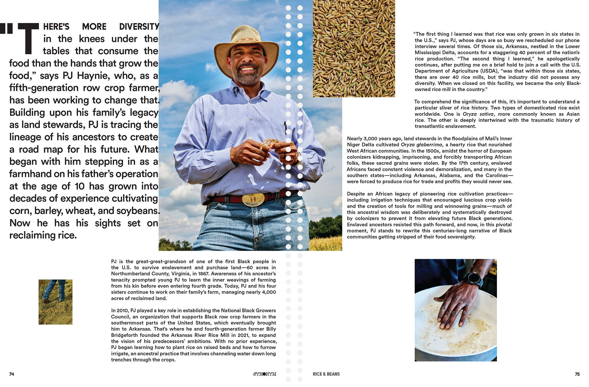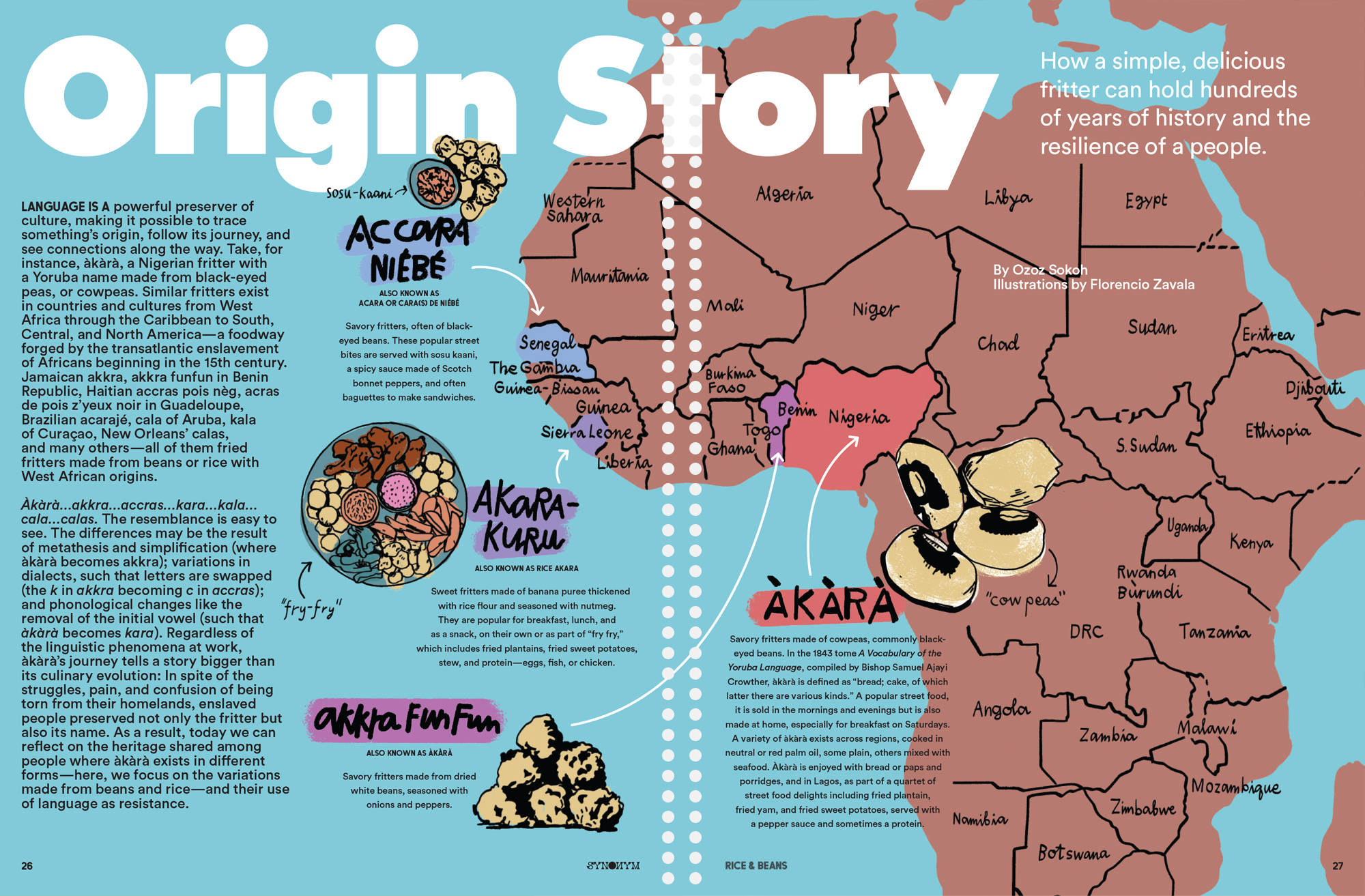 Each issue is based around a theme — pantry, rice & beans, spices, and enclaves so far — so we started assigning a color and implementing a new typeface each time, allowing the design language to grow and evolve while still retaining its overall structure. As opposed to a traditional front and back of book format, recurring stories are sprinkled throughout each issue, breaking up the longer form features when needed. All of the elements are very intentionally gathered — from the writers, the photographers, and the contributing artists — to be a part of and nurture a growing sense of community and connection with each other as these stories are shared.